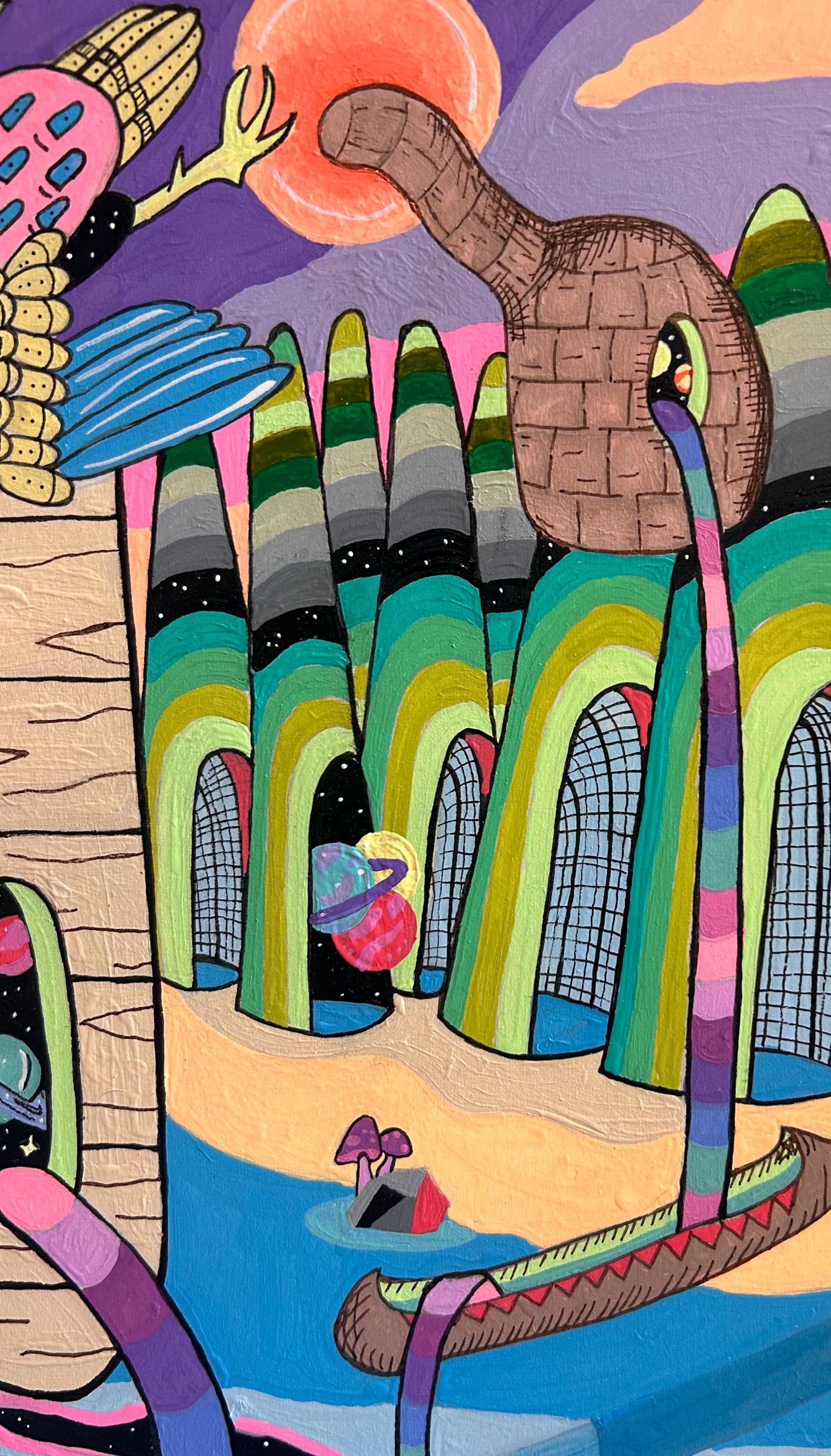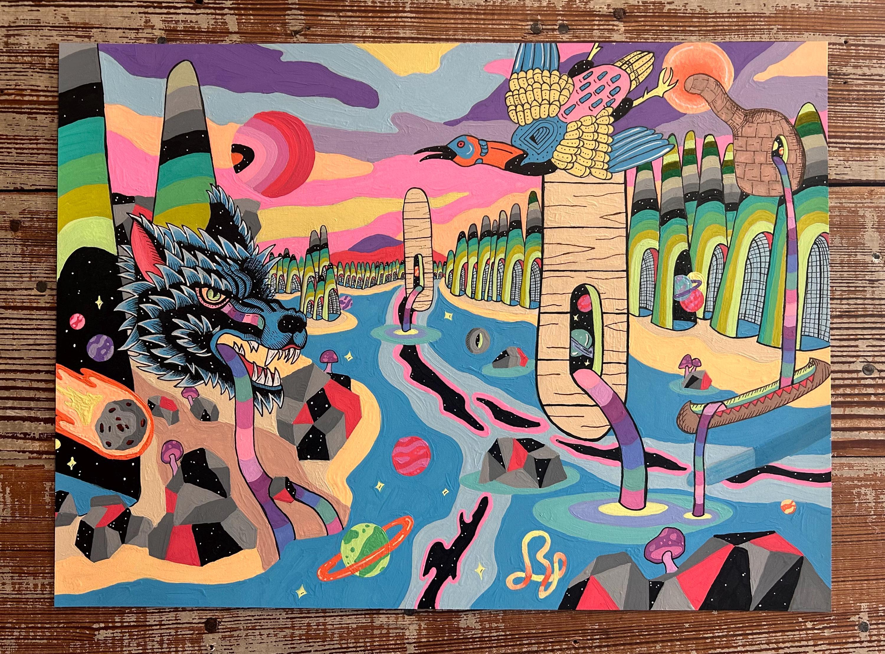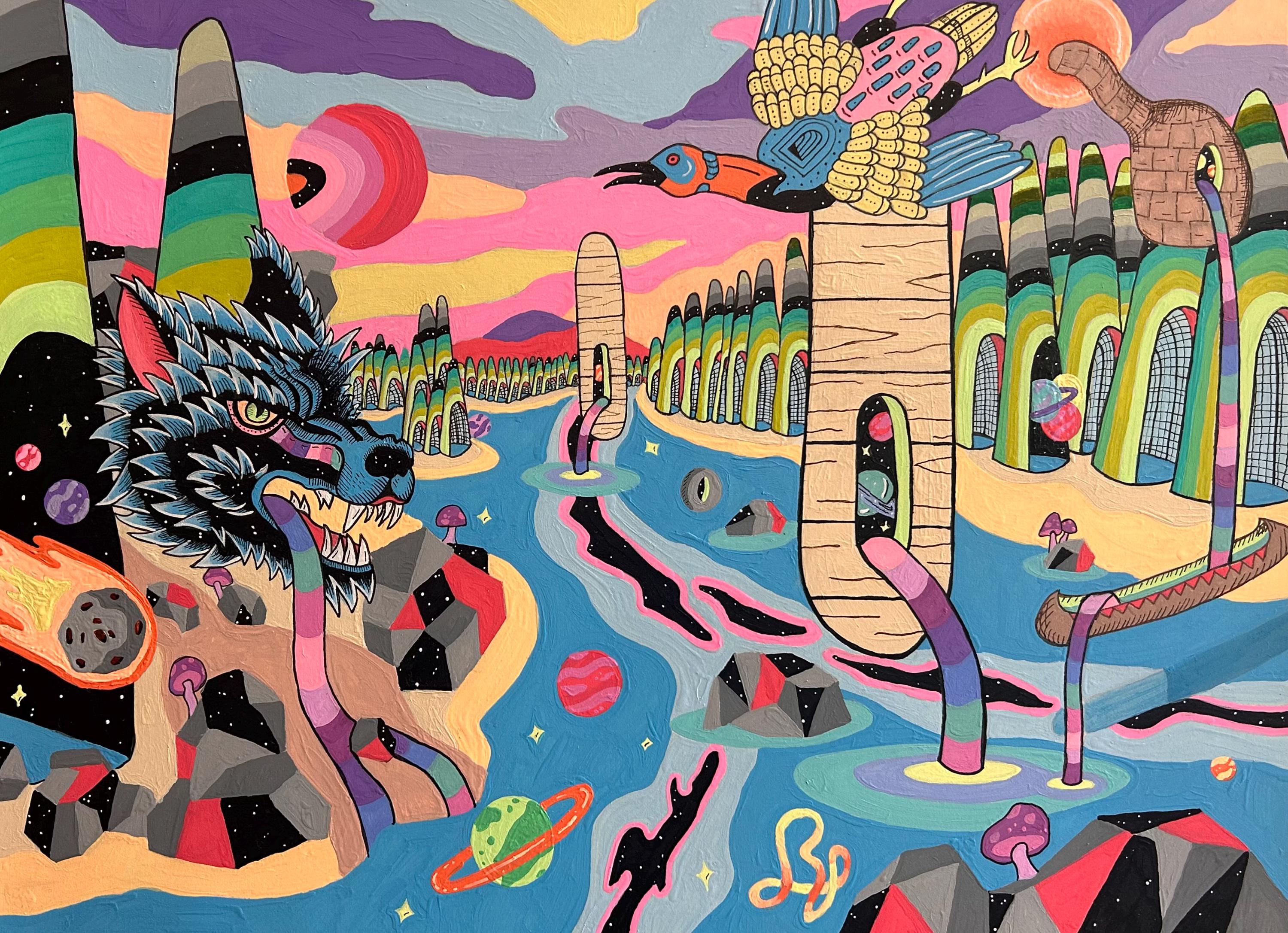 Ecosystem #1 explores the childlike sense of wonder we experience in nature and the hidden connections between the natural world, the cosmos, and human history. Through saturated color and bold, playful forms, the piece imagines a living landscape where creatures, planets, rivers, and architecture exist as part of a single interconnected system.