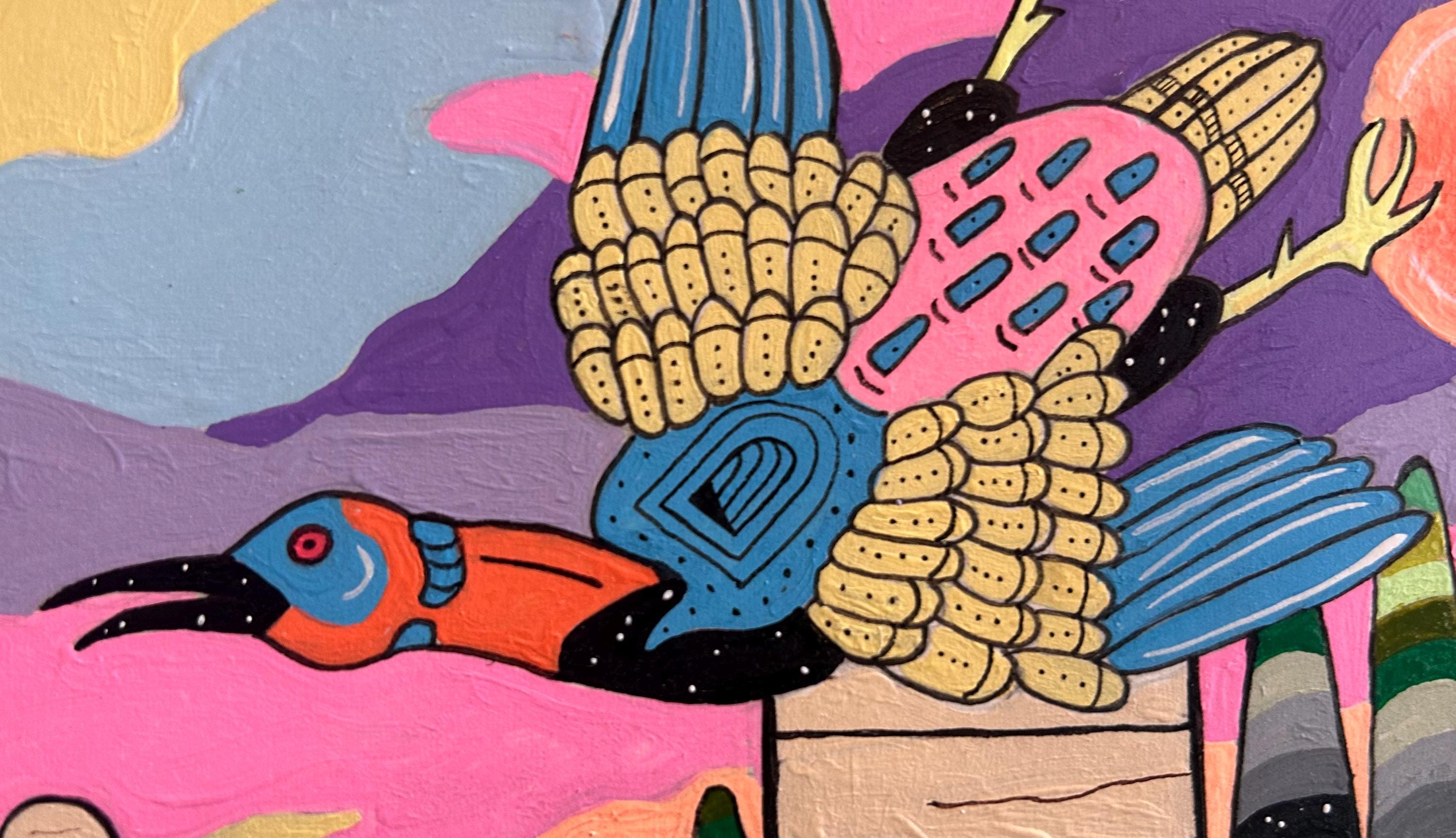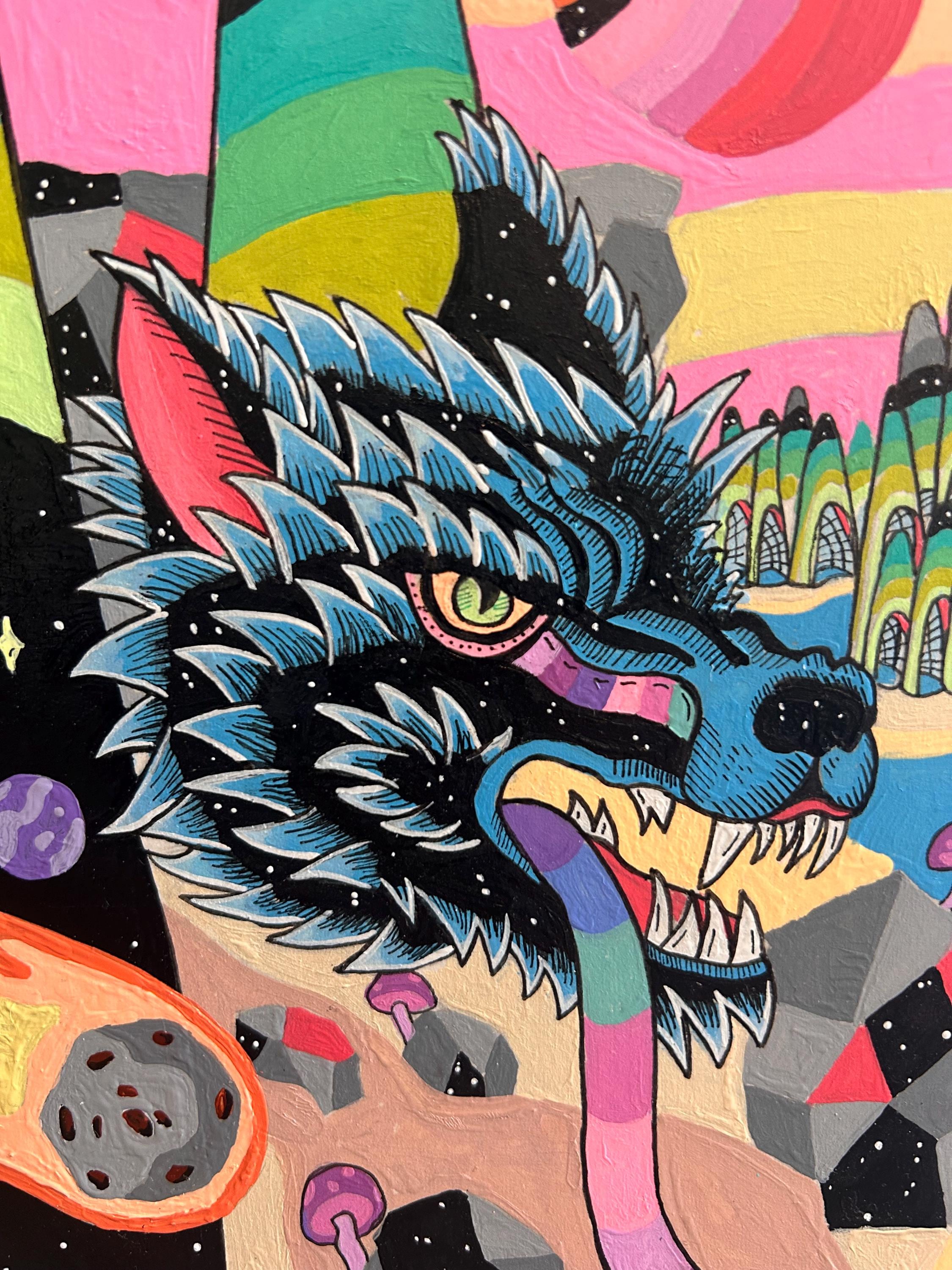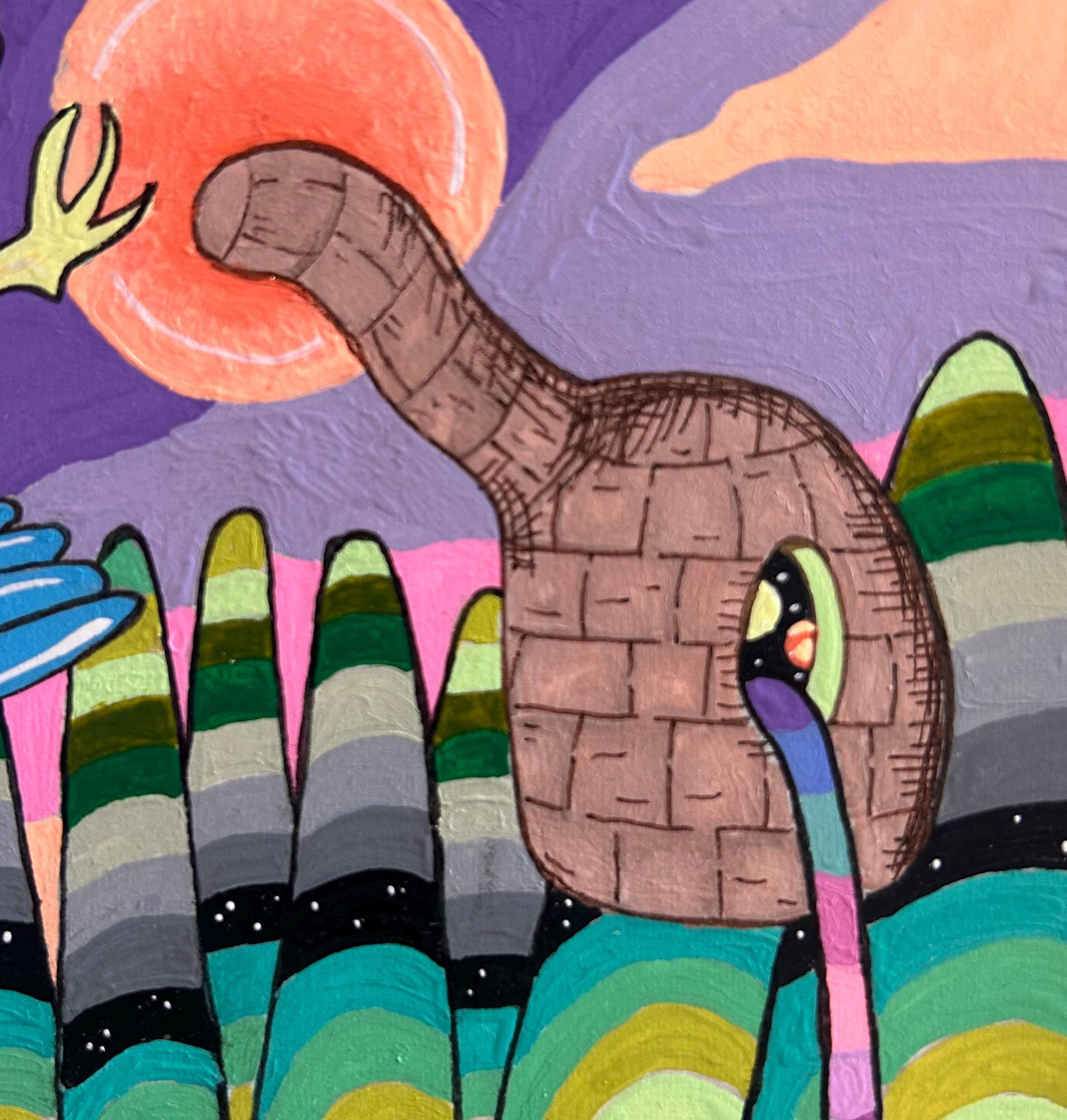Ecosystem #1 explores the childlike sense of wonder we experience in nature and the hidden connections between the natural world, the cosmos, and human history. Through saturated color and bold, playful forms, the piece imagines a living landscape where creatures, planets, rivers, and architecture exist as part of a single interconnected system.